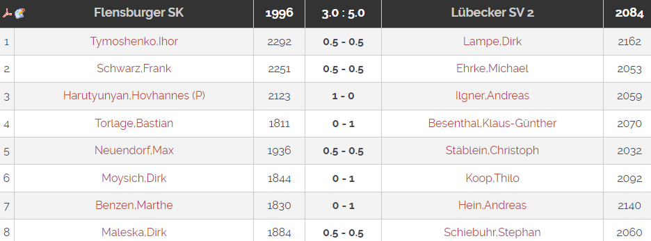 Die Spannung war greifbar — auf beiden Seiten. Flensburg – Lübeck 2, wie zur Eröffnung des Kampfes durch den Flensburger Mannschaftsführer, Dirk Maleska, angekündigt, war aktuell das Spitzenspiel der Landesliga. An der Tabellenspitze trennten beide Mannschaften nur 0,5 Brettpunkte. Der Lübecker Kapitän zeigte den Respekt vor Flensburg durch Aktivierung von starken Spielern bis zum letzten Brett. Flensburg musste dagegen auf 2 starke Spieler verzichten, da am selben Tag die dänische Liga spielte und für die beiden betroffenen Dänen verständlicherweise die Heimatliga Vorrang hatte.