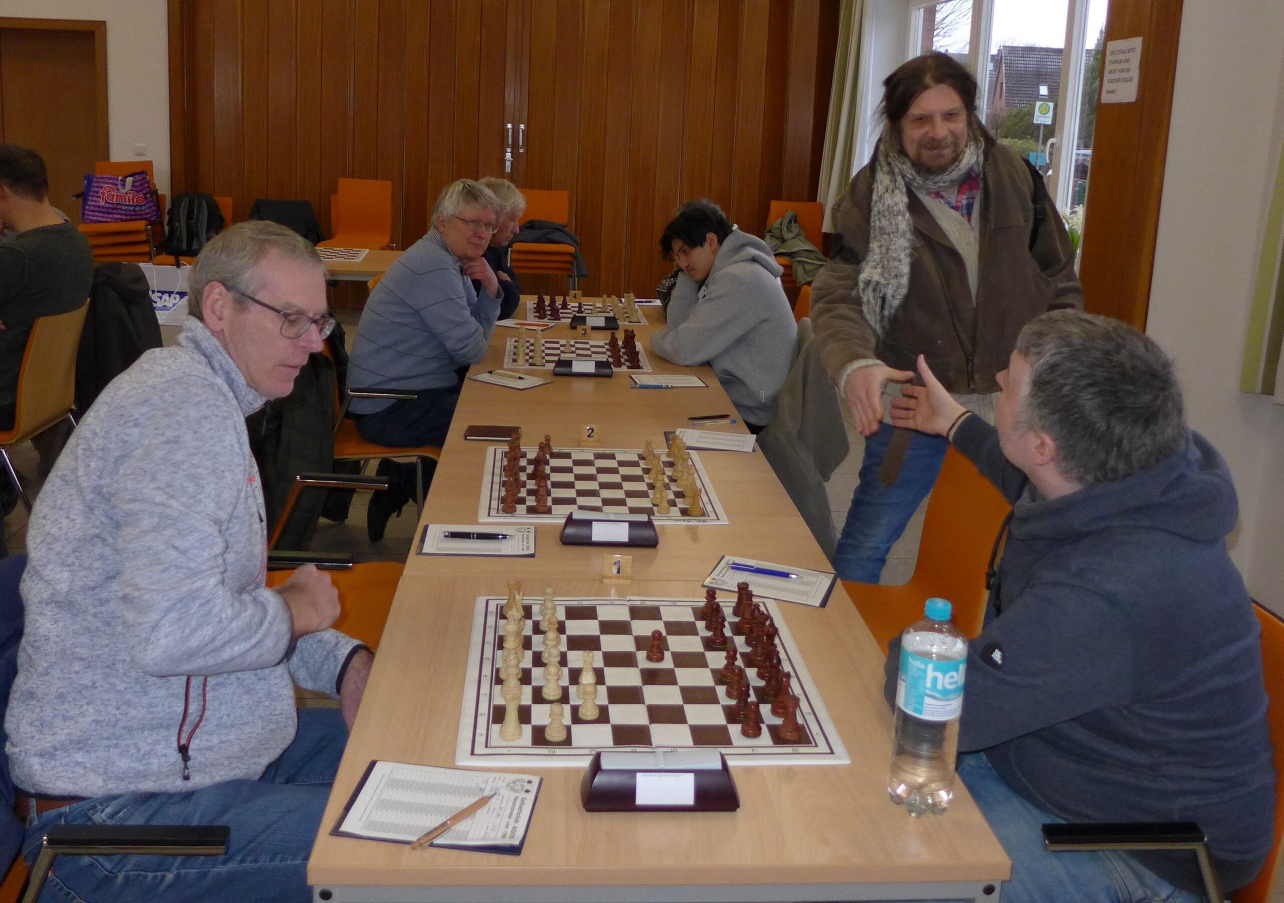 Als Team haben wir in Neumünster wahrhaft „Aufbauarbeit“ geleistet, denn als wir um 9Uhr35 (!) in der schönen Ausweich-Spielstätte ankamen, war nur ein Vertreter des Gastgebers vor Ort. Somit halfen wir, die Bretter und Uhren aufzubauen, die Stühle beizustellen etc..