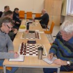 Nach der Zeitkontrolle waren Joachim und ich im „Analyseraum“ aber optimistisch: Brett 1 schien mit Zeitvorsprung auf der Uhr etwas besser zu stehen und Brett 8 sollte trotz Minusbauer mit zwei Türmen und einem starken Springer gegen Doppelturm und schlechten Läufer ein Remis behaupten. Bald überbrachte Martin, der das resultierende Doppelturm-Endspiel „locker“ unentschieden hielt, eine Hiobsbotschaft: Hartmut hatte sich eine Qualität „wegkombinieren“ lassen und verlor trotz Gegenwehr das Endspiel ohne echte Chance.