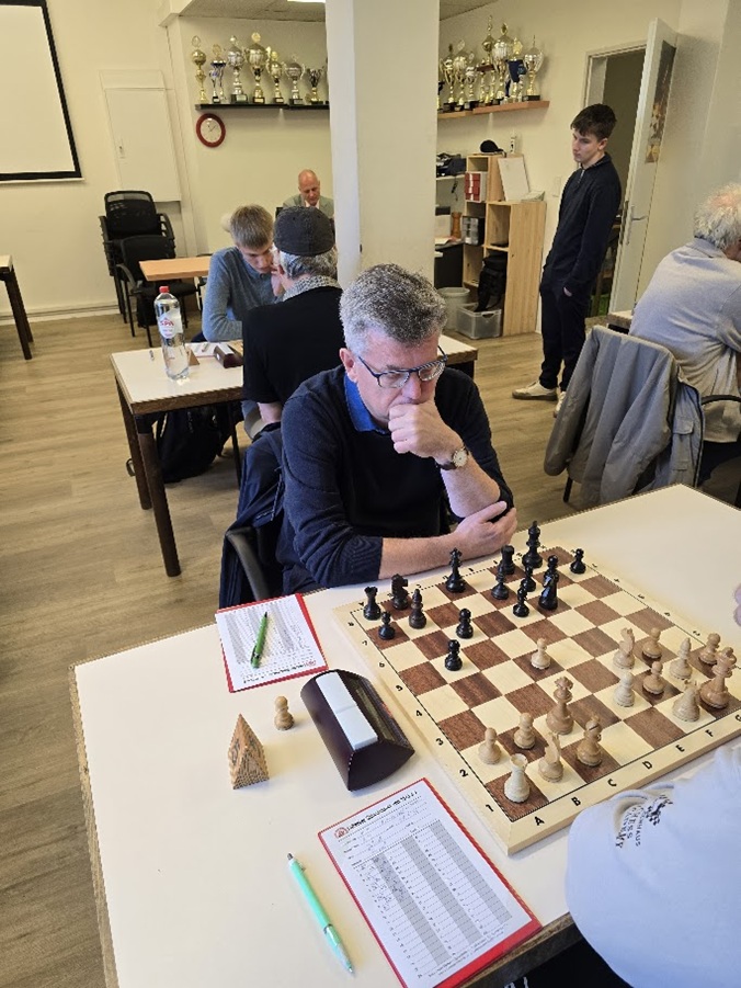 Steffen spielte gegen den Senior unserer Gäste. Die von Weiß gewählte Eröffnungsvariante stammt konsequenterweise meines Wissens aus den 80ern, aber dem Bedenkzeitverbrauch nach zu urteilen, ist sie wieder aktuell. Am Ende ergab sich ein Remis, die Details entziehen sich wiederum meiner Kenntnis.