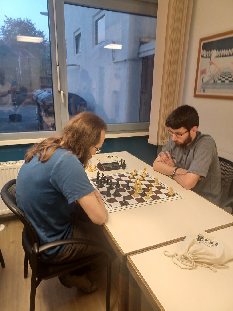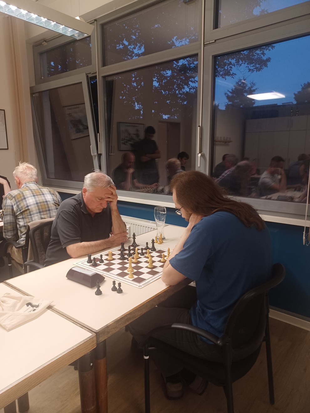 22 Teilnehmer sind für einen Freitag in den Sommerferien eine hohe Beteiligung. Trotz der Abwesenheit des zweiten Turnierleiters und des Vorsitzenden gelang es mir, ein Kurzremis zu spielen, nach meinem Eindruck war das die einzige Partie im gesamten Turnier, die nicht ausgespielt wurde. Nach einem etwas wackeligen Auftakterfolg gegen den Turnierleiter folgte ein Sieg gegen den Jugendwart der 80er Jahre. In der dritten und vierten Runde kam es dann zu zwei Premieren, gegen beide Gegner hatte ich nach meiner Erinnerung noch nie gespielt. In beiden Fällen gelang es mir zu gewinnen. In der letzten Runde gab es dann das bereits erwähnte Kurzremis gegen den mehrfachen Gehörlosenweltmeister, was zum Turniersieg reichte. Fünfrundige Turniere haben ihre ganz eigenen Gesetze, am Ende hatte ich nur gegen zwei Spieler aus den TOP 9 gespielt - für mehr Runden müsste man allerdings die Bedenkzeit verkürzen.